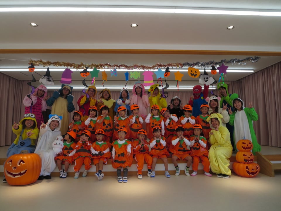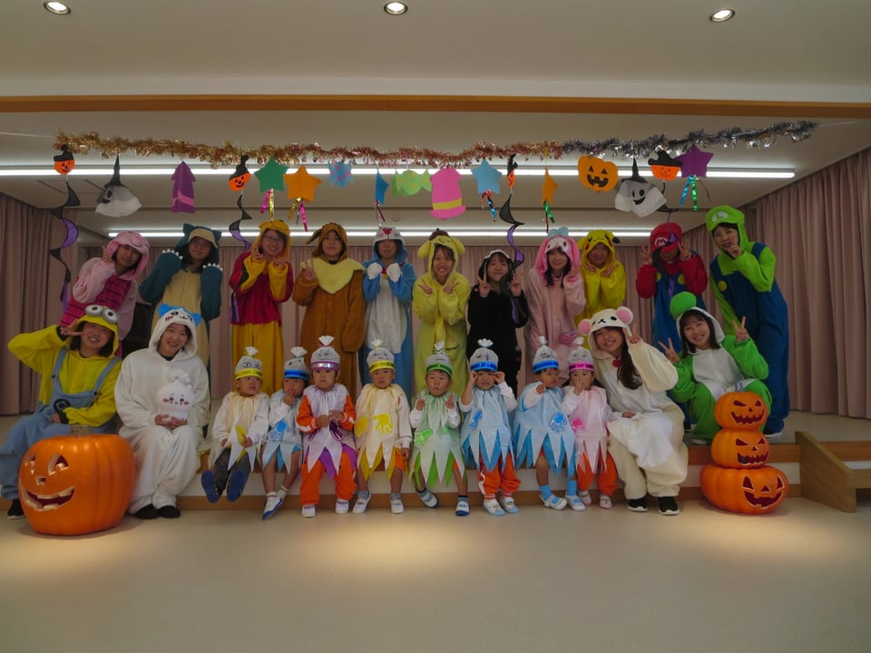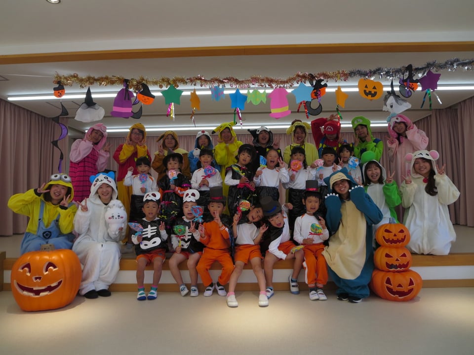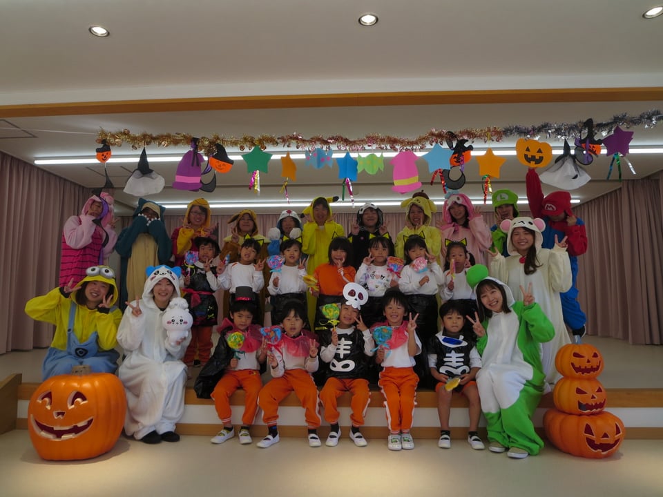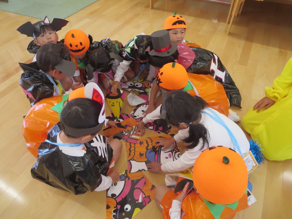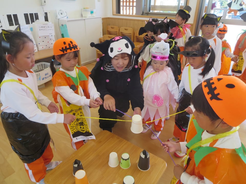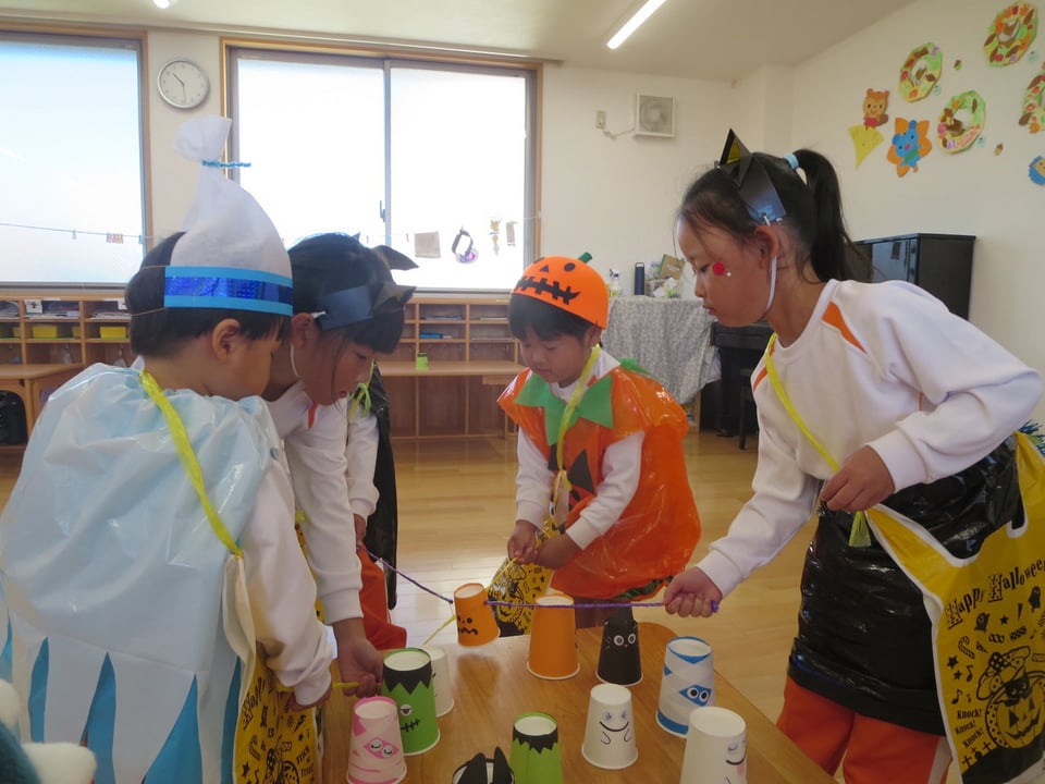 先生も子ども達もみんなで仮装をして、大型パズル・目玉投げゲーム・おばけ運びリレー・オセロゲームの4つのゲームを楽しみました💞