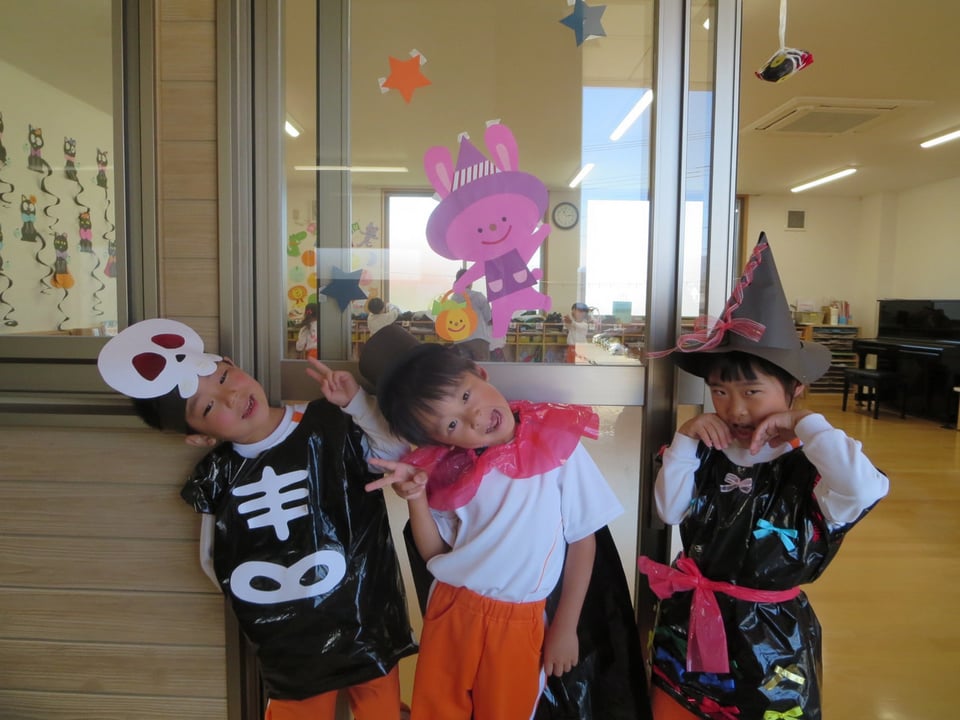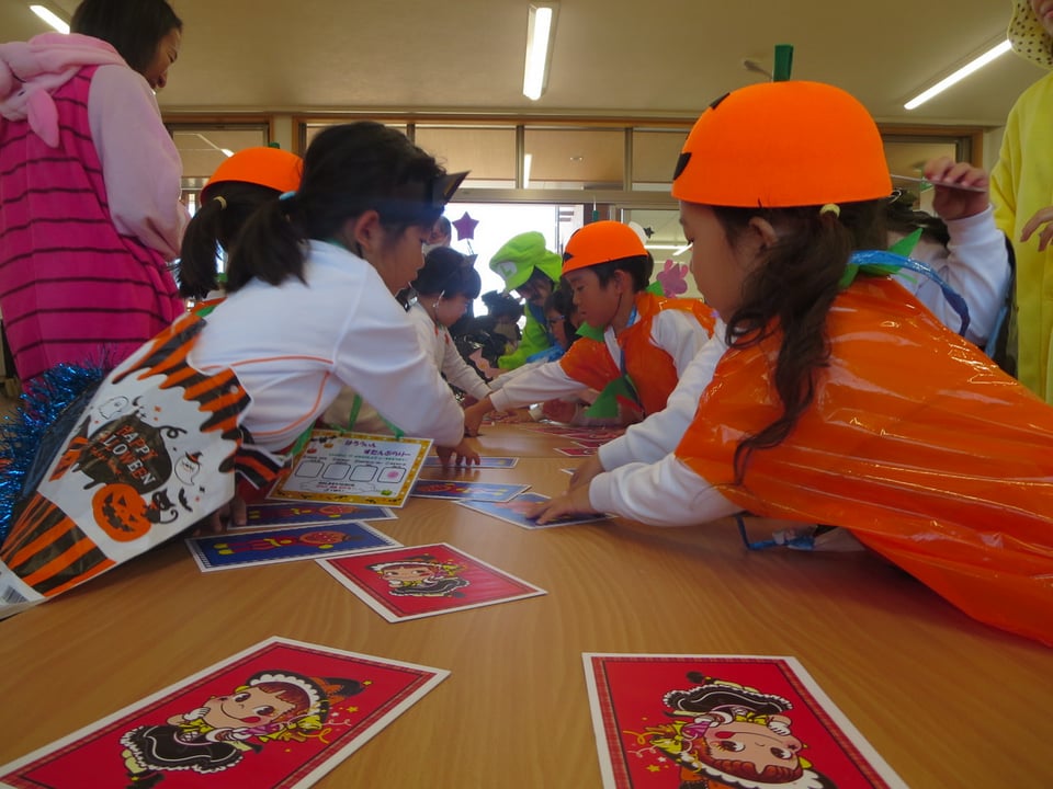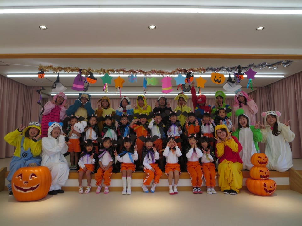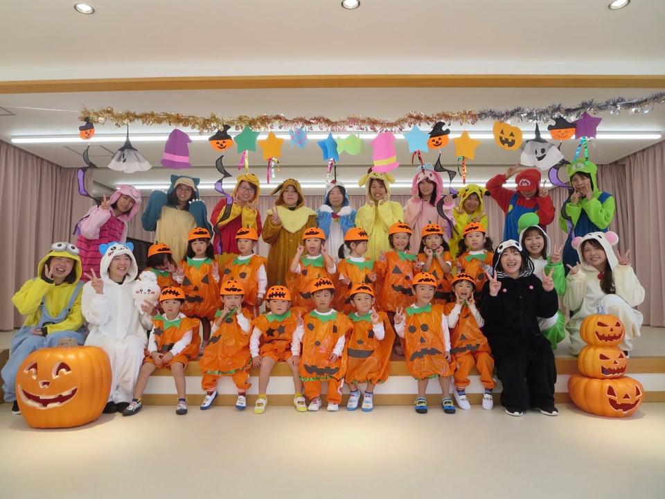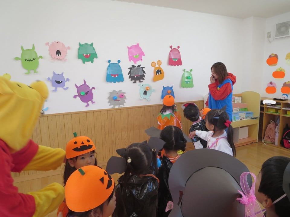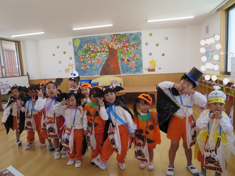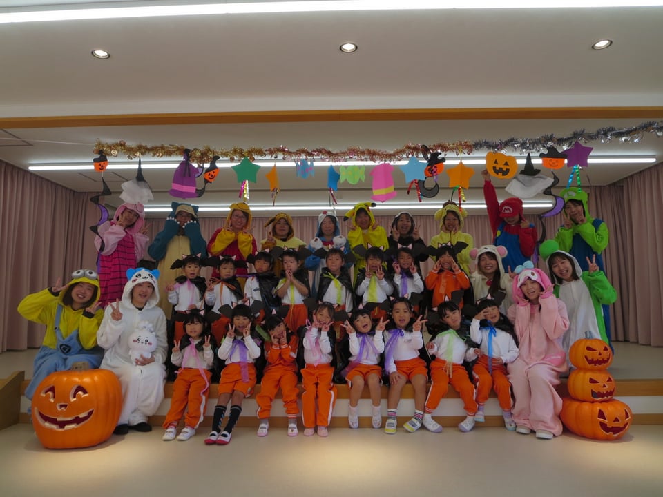 先生も子ども達もみんなで仮装をして、大型パズル・目玉投げゲーム・おばけ運びリレー・オセロゲームの4つのゲームを楽しみました💞