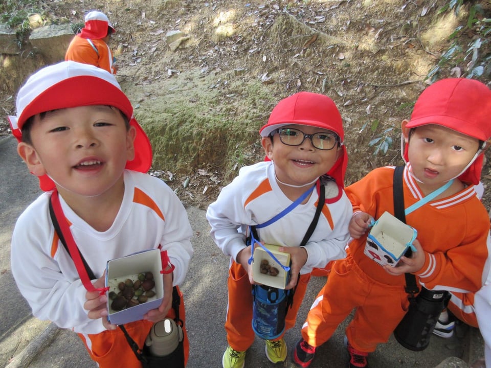 沢山落ちている中から自分好みの自然物を集めては、「こんなにいっぱいになったよ!」「帽子ついてるどんぐりあったよ!」「この木の枝どんぐりがくっついてる!面白いね!」と、色々な発見や虫観察も楽しみました🎵