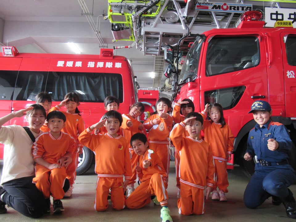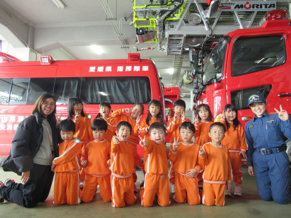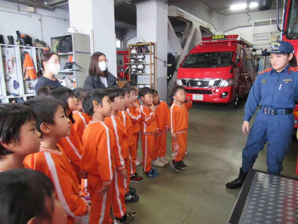 最後に本物の消防車を見学させていただくと、子ども達は「このホースなに?」「どのぐらい長いの?」「すごーい!」と興味津々な様子👀