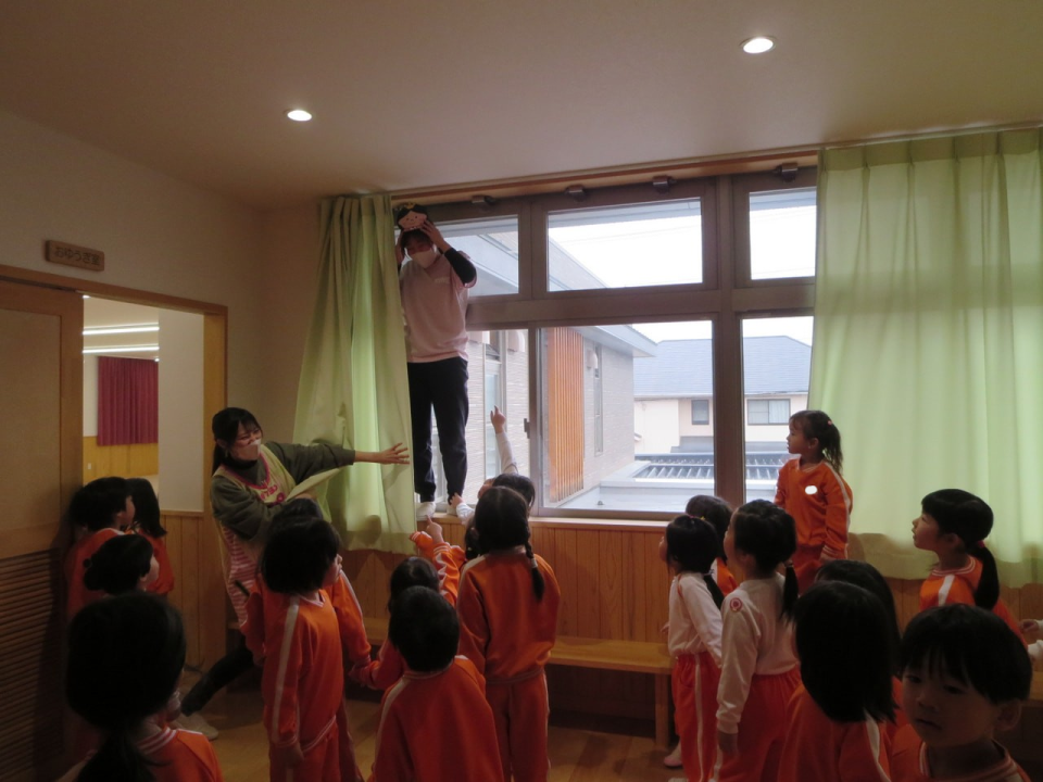 ひな人形のお面を被って園内のいたる所に隠れている先生たちを、縦割りグループごとに見つけに行きました👀